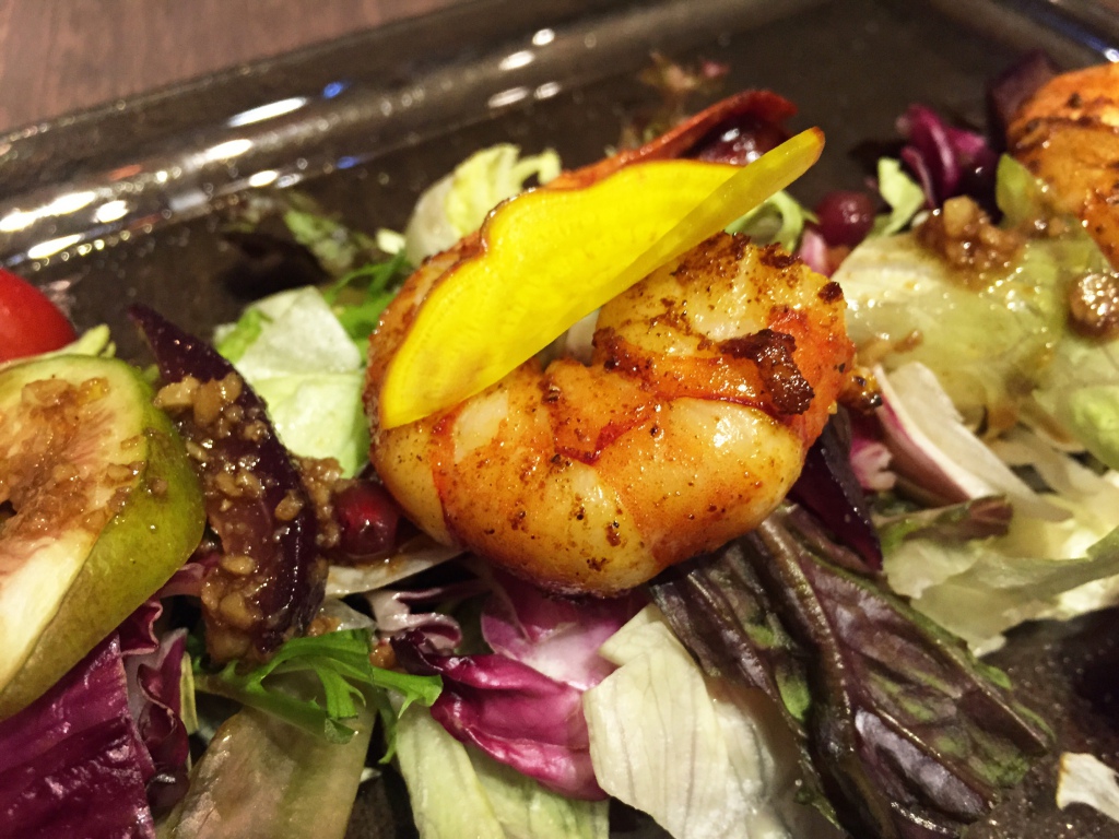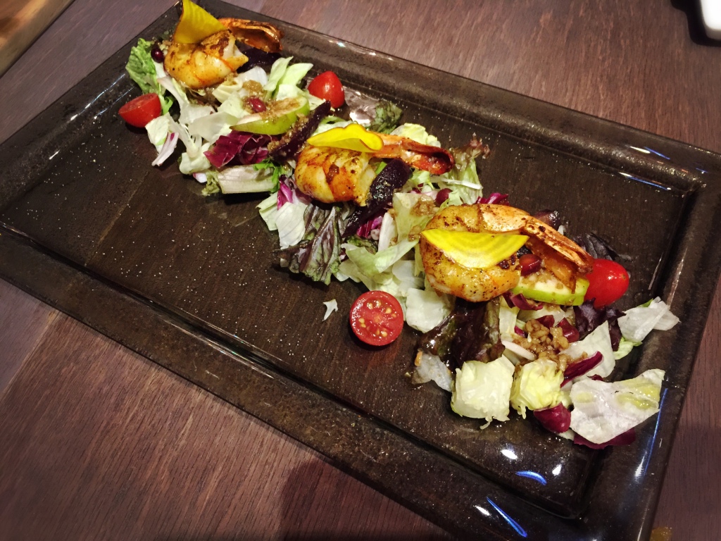 鮮蝦已經去殼,烤得很香很入味,搭配生菜和水果的沙拉吃起來超可口!蝦上面那黃色的是甜菜根喔~