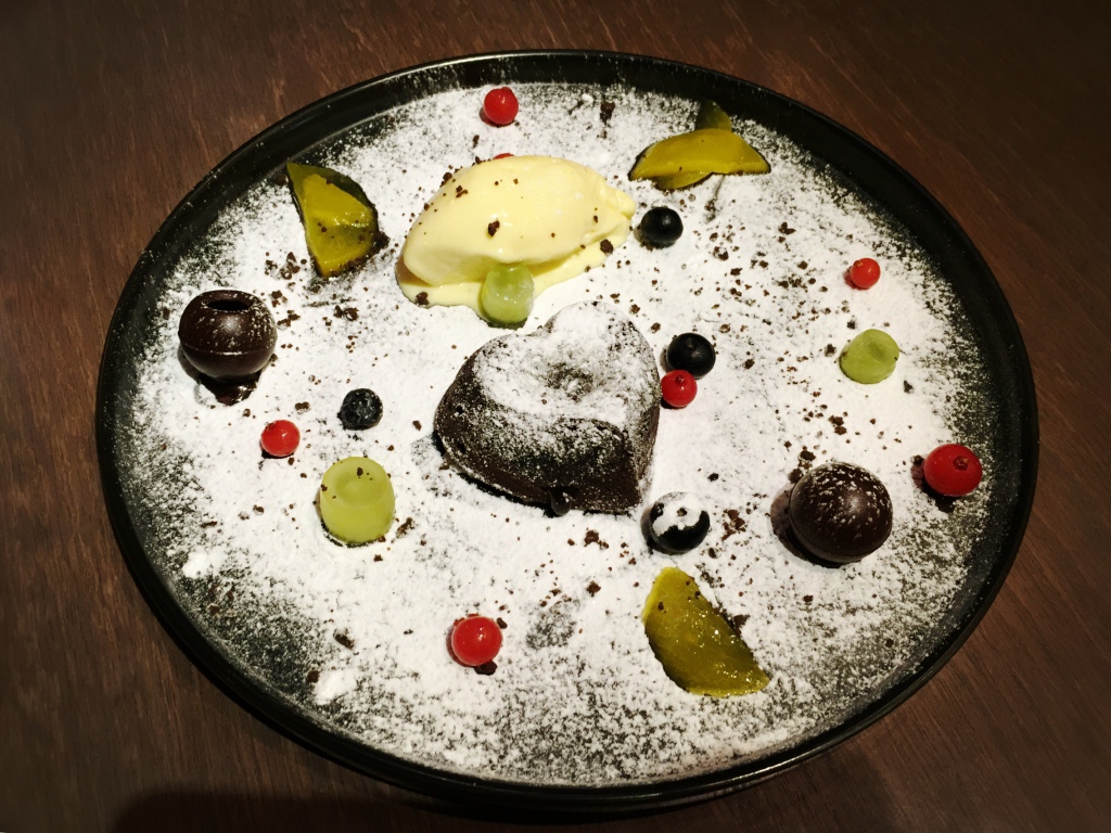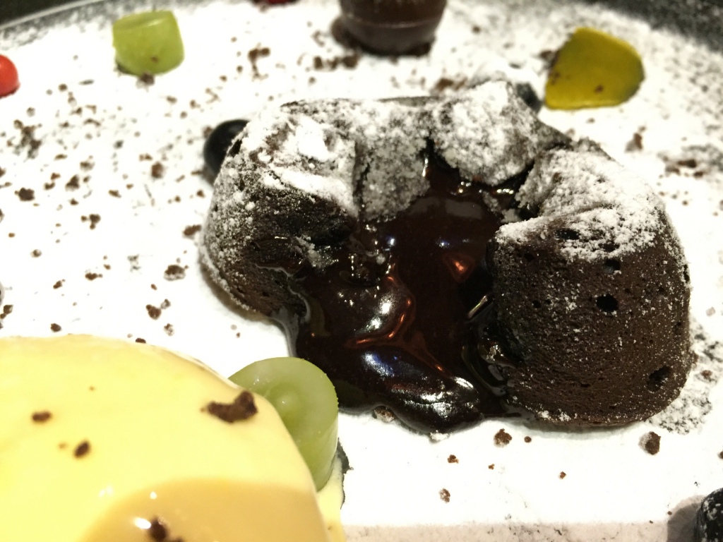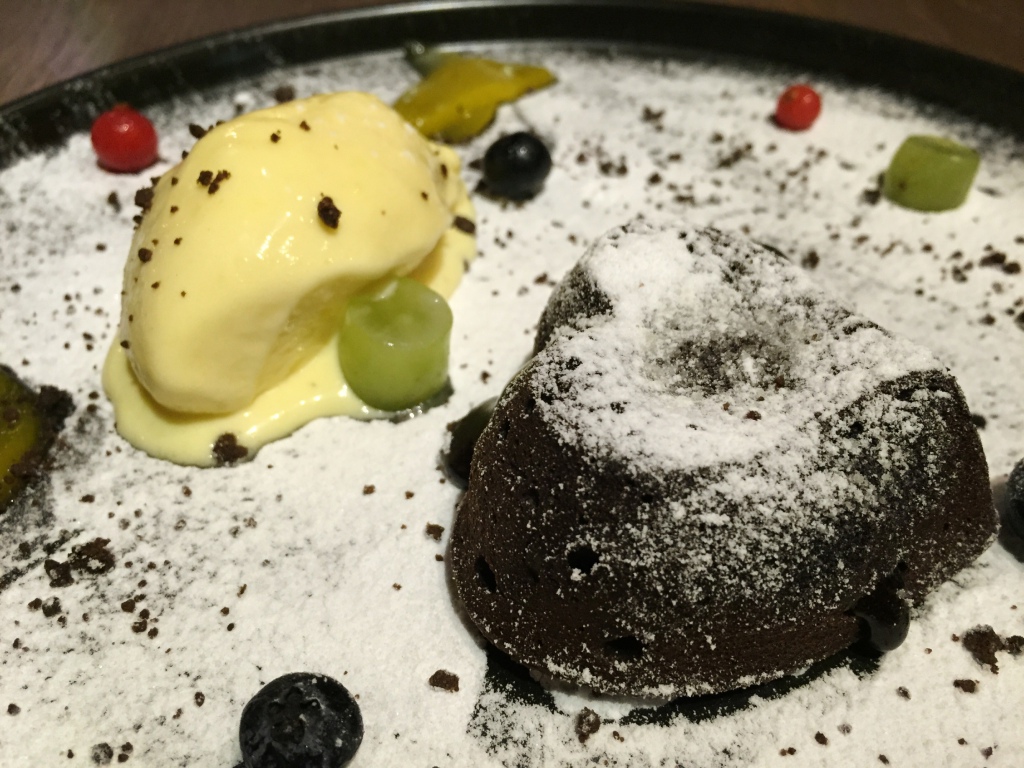 甜點只有兩種,一種是熔岩巧克力蛋糕,另一種是法式薄餅,我們點的是熔岩巧克力蛋糕+自製冰淇淋200元。