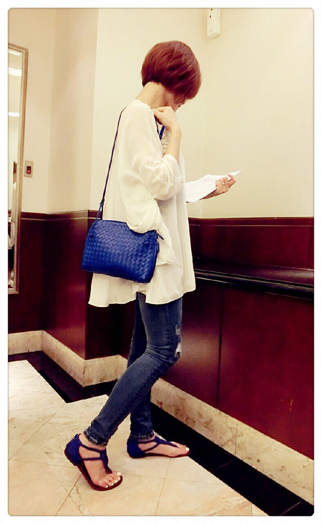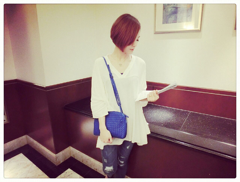 白色軟料的寬鬆上衣其實是秋裝了,但是冷氣房裡穿可是剛剛好,配上破壞感牛仔褲多點個性,藍色夾腳涼鞋跟包包呼應的剛剛好XD