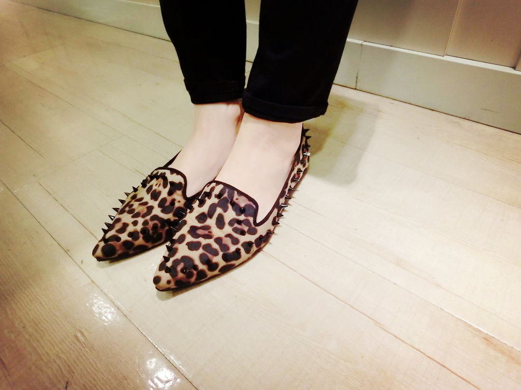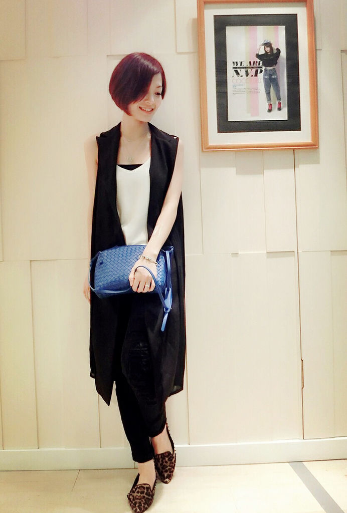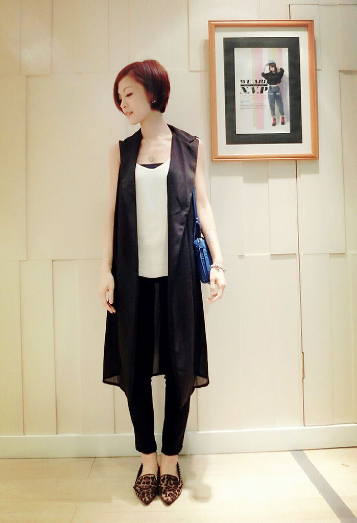 春夏的雪紡材質上衣搭配西裝領長版背心,破壞感黑色緊身牛仔褲,豹紋鉚釘Loafers也是最近的新歡。