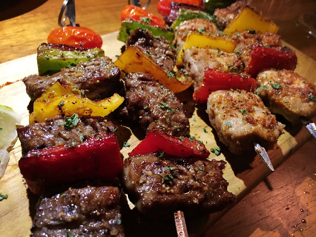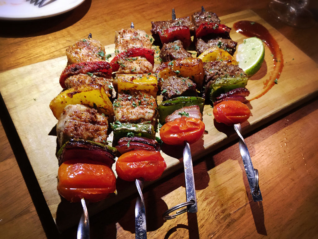 香料烤牛肉串(兩串)260元,香料烤豬小里肌肉串(兩串)180元,肉搭配著各種顏色的蔬菜,看起來很豐富呢!