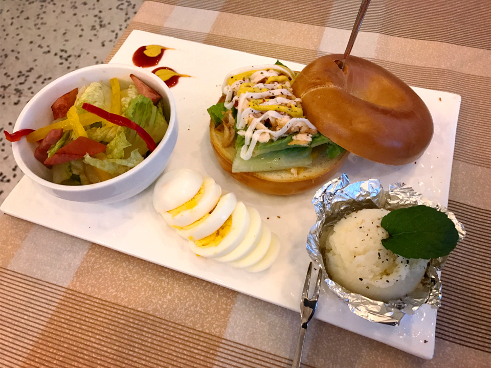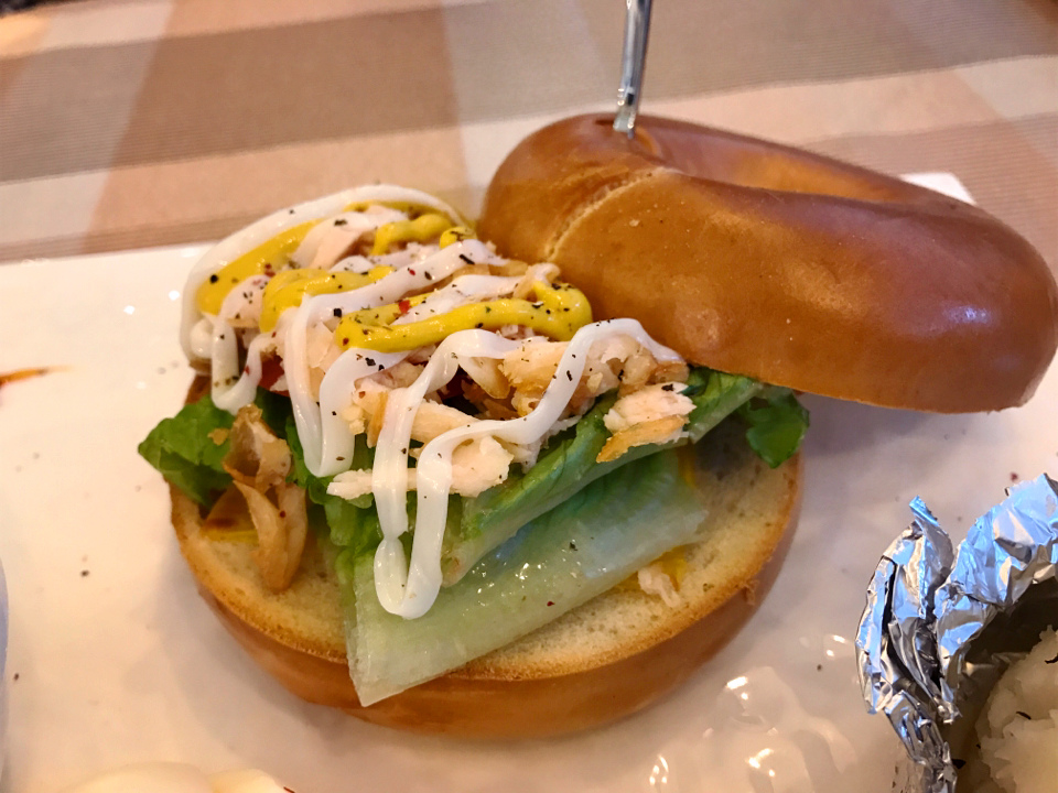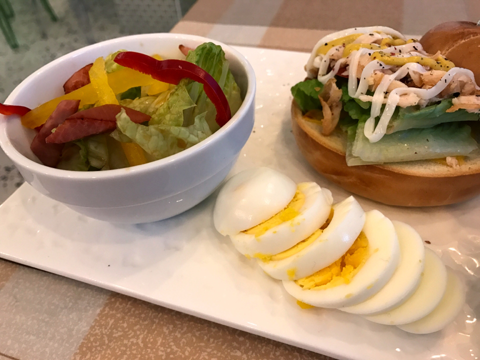 燻雞貝果套餐320元,附了沙拉、蛋、馬鈴薯泥,感覺還蠻健康的。貝果的顏色看起來有點深又硬硬的,沒想到吃起來還好,軟軟的不會太有嚼勁的口感,搭配燻雞以及生菜,還有蜂蜜芥末醬的提味,算是還蠻好吃的,整個擺盤的賣相也蠻不錯的。