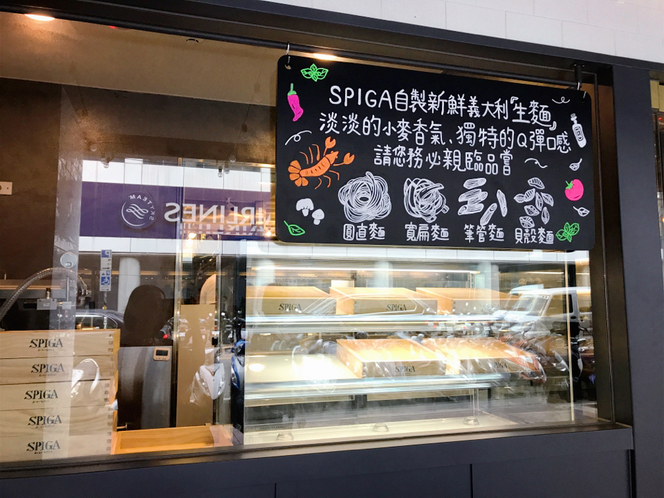 這間SPIGA PASTA在裝潢時我們就已經發現了,後來網路上看到新聞,原來是日本的一間連鎖義大利餐廳,好像還蠻有名的喔!因此也特別的期待他們的開幕,記得那天是平日中午快要一點時,和小co特地來吃,結果登記了說要排隊大約一小時,我們就想說晚一點再來好了,因為他們下午時段也有營業喔!現在可能剛開幕,生意真的很好,要來吃的話最好是避開用餐人潮,不然可能要等很久喔!這間和別的義大利麵不同的地方在於他們的麵都是在店裡現做的,不像一般都是乾的義大利麵,而是現做的生麵,口感也比較軟Q一些,還有各種麵條種類可選喔!