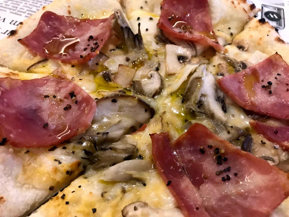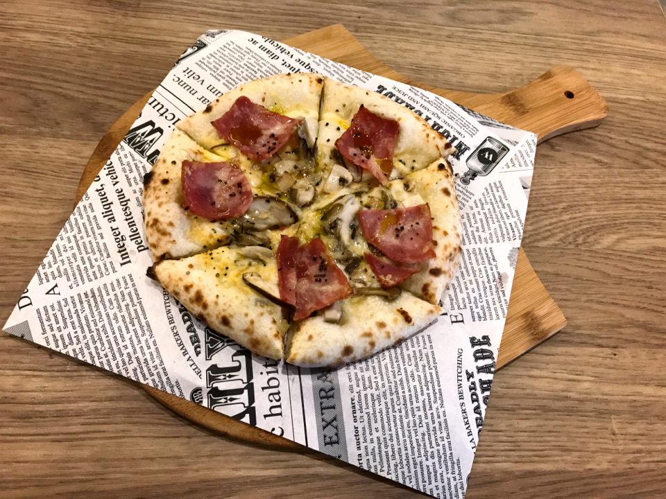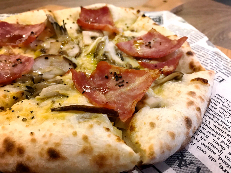 綜合野菇披薩180元,不算大的披薩大約6或7吋吧?!味道不會太重,培根和野菇的鮮味還蠻不錯的,一點橄欖油調味,餅皮雖然算是薄的,但是有嚼勁的那種,吃起來會蠻有飽足感的,烤得很香,口味也算不錯,不過因為前面吃到的義大利麵很好吃,披薩瞬間被比下去了XD!兩個人來吃的話,各點一種倒是蠻不錯的。