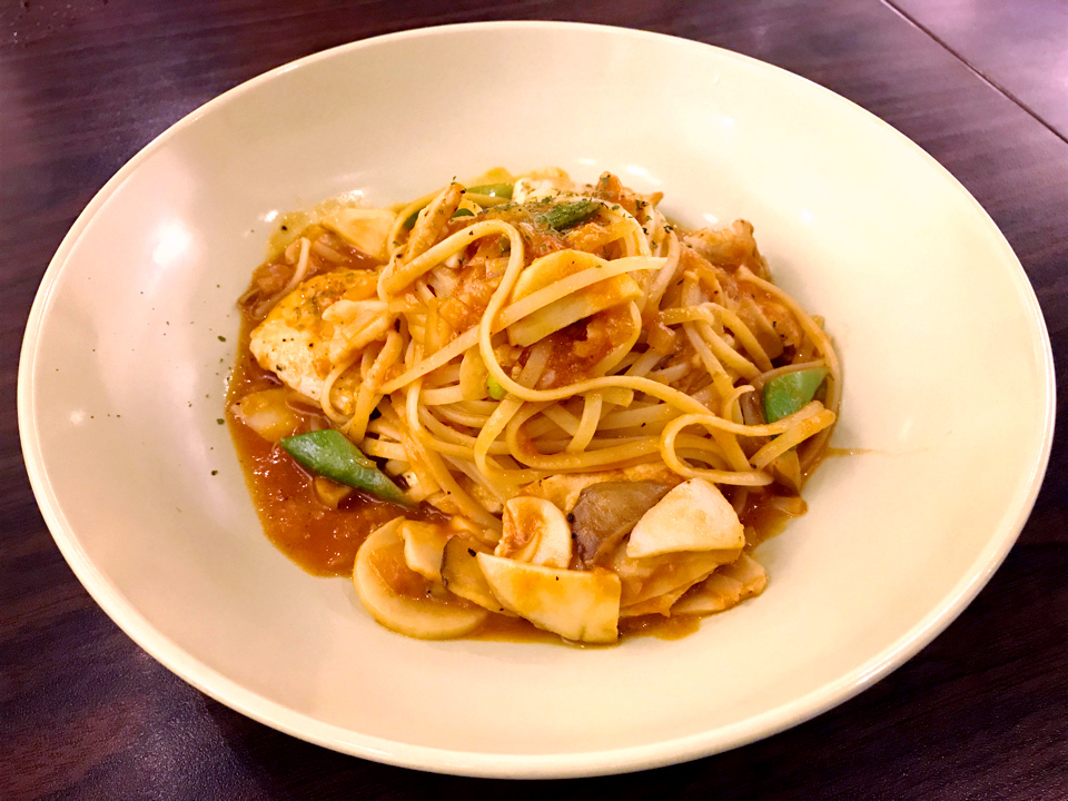 番茄菇菇雞細扁麵,一般細扁麵吃起來都會比較軟,不過這裡的算是中等的軟硬度,有一點嚼勁的。醬汁不是濃稠的那種,有點台式的作法,雞肉很嫩,搭配菇類吃起來蠻清爽,麵條炒得很入味,不會太重口味,算是一般口味還不錯。